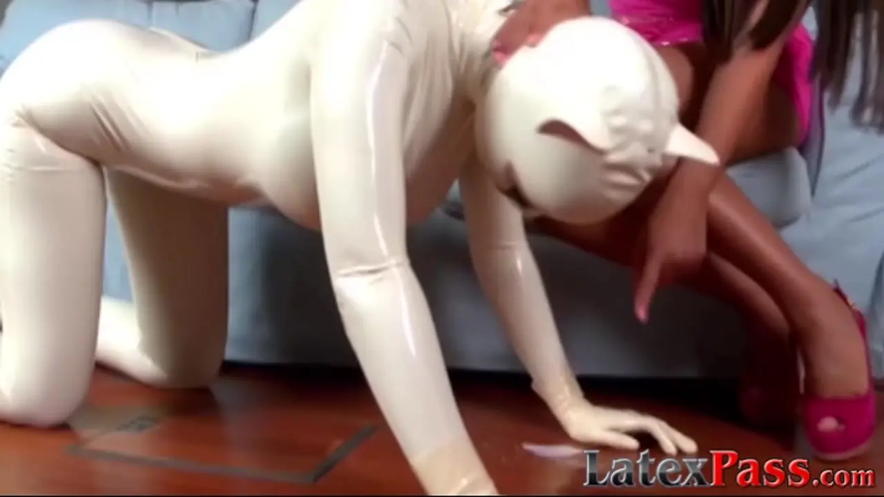 Brunette babe in latex kitten suit gets spanked and licked