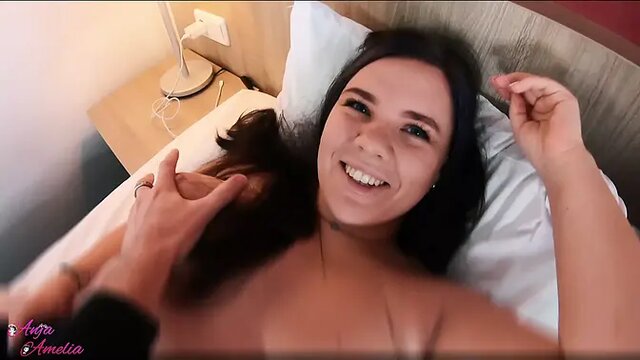 slutty amateur couple AnjaAmelia and her guy have a steamy homemade hotel fuck. She rides his hard dick while he slams into her from above, their POV captured in 60 fps. He also gives her a handsjob and she licks her pussy before he cums inside her.
